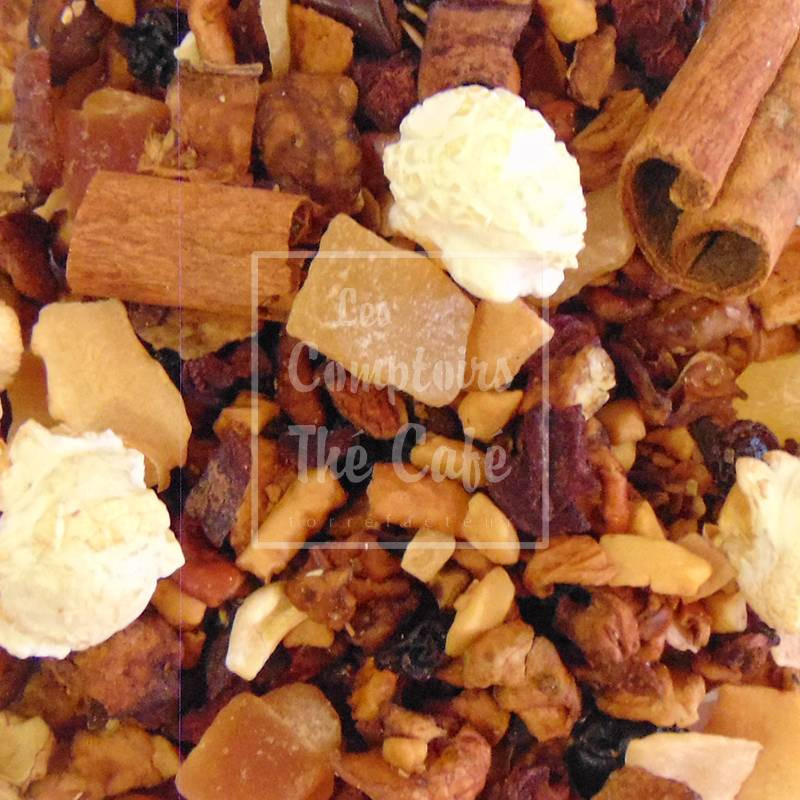 Infusion pomme, raisin, coco, ananas, papaye, amande, pop corn.
